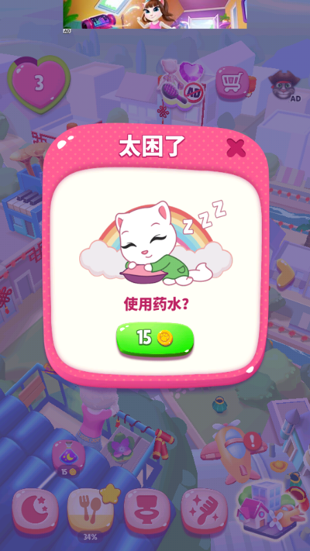 建议:不要点击饥饿药水,如果大家没有金币去购物或者想要积攒金币的时候,可以去看一下广告,来获取免费的食物哦!