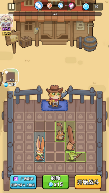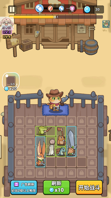 3、以猫猫牛仔为核心角色,搭配各类动物伙伴,画风贴合休闲竞技定位。