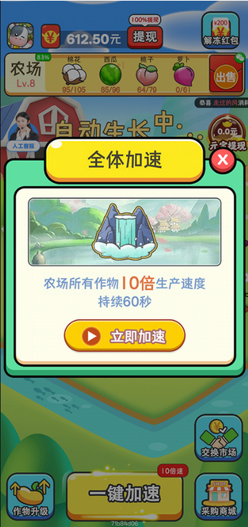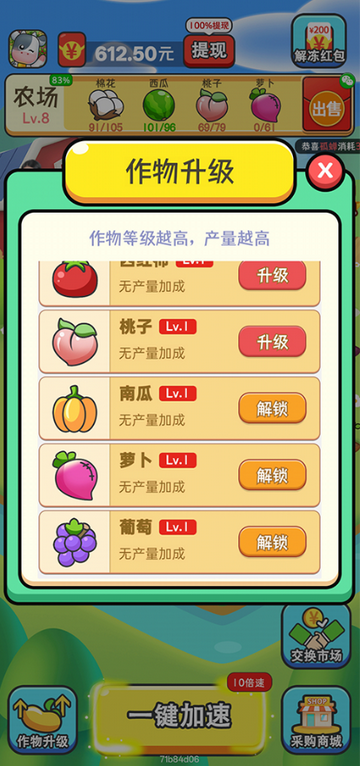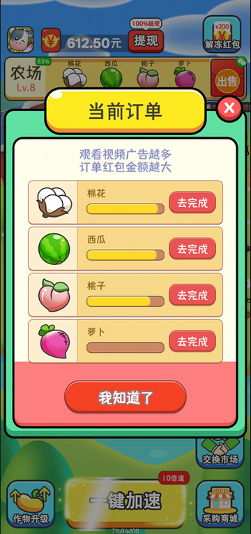 2、种植收获农作物、换取订单红包、兑换现金,流程简单易懂,收益可直接变现。