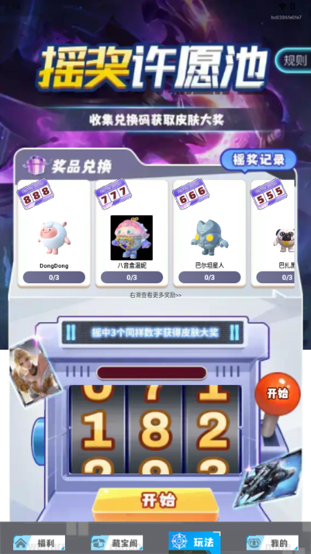 1.用户通过摇奖获得3个相同数字的兑奖码可以兑换皮肤大奖