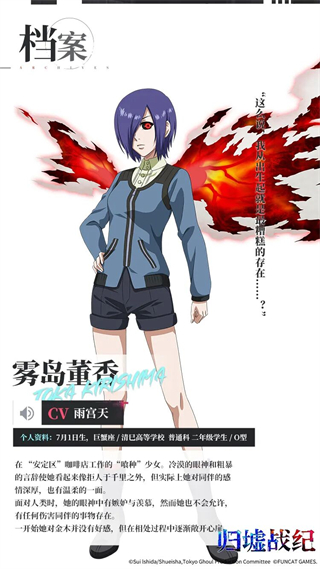 在“安定区”咖啡店工作的“喰种”少女。冷漠的眼神和粗暴的言辞使她看起来像拒人于千里之外,但实际上她对同伴的感情深厚,也有温柔的一面。