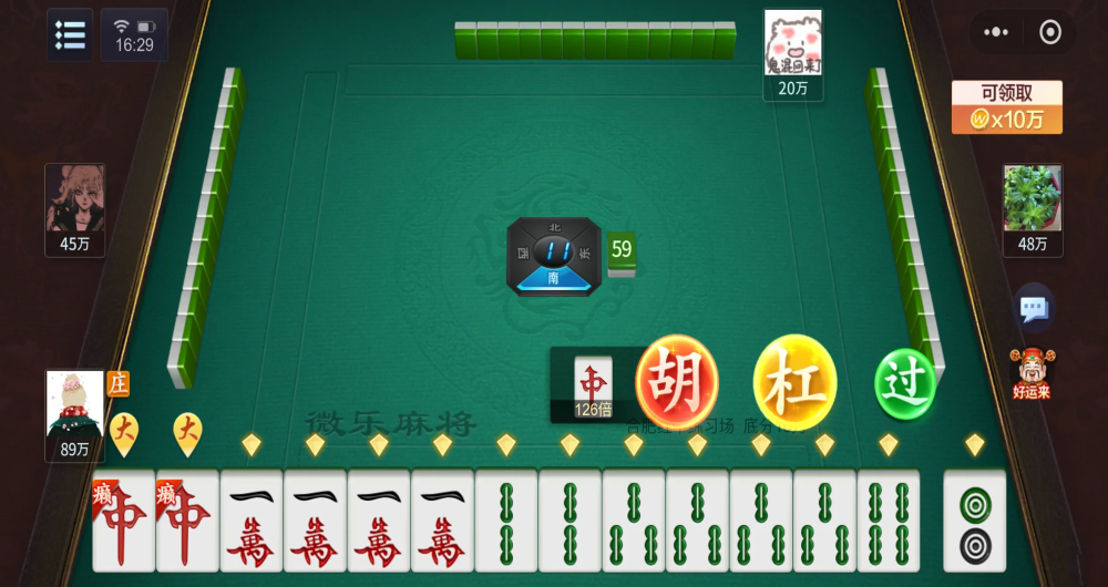 逆时针出牌,碰>吃,支持“一炮多响”