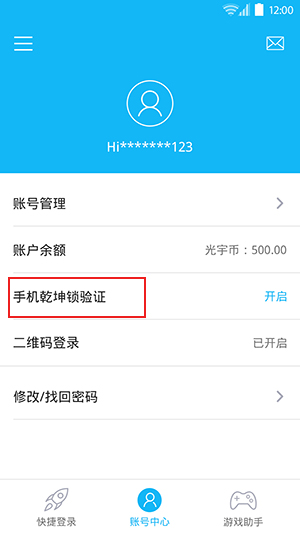 进入【帐号中心】,点击【手机乾坤锁验证】,点击开启即可。