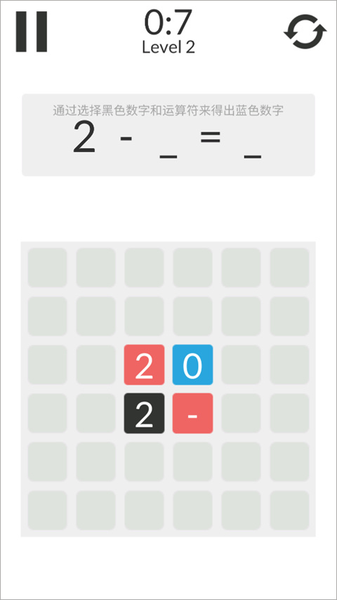 4、点击选择黑色数字和运算符形成计算式,当计算式的结果等于蓝色数字时,可进入下一关