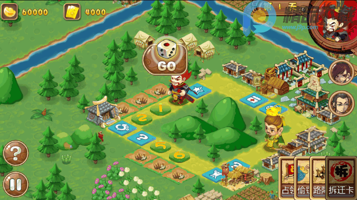 角色选择与基础操作:玩家可选择刘备、曹操等三国名将作为角色,通过掷骰子决定移动步数,在棋盘地图上探索城池、资源点等区域。
