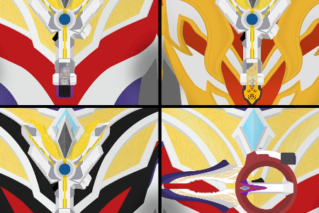 永恒闪耀特利迦:特利迦吸收永恒核心碎片力量后的进化形态,胸前有三个计时器,分别代表三种基础形态,拥有专属武器闪耀之刃,必杀技为闪耀哉佩利敖光线。