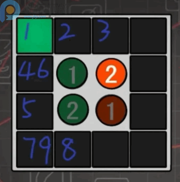 2.回到「人1」解绿色按键的谜题(图2)得【宝石】,回「人2」用【杀虫剂】喷绿色毛毛虫,得「人物卡3」。