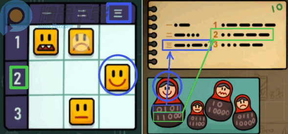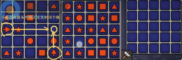 5.解开「人5👮♂️」符号时钟谜题(图6),得「人物卡6」,玩5×5蓝格子小游戏(图7)得【钉锤】,【钉锤】砸开「人4」石膏得【磁盘】,【磁盘】插入「人3」电视中。根据「人6」雷达提示解开「人2」中黄红蓝坐标谜题(图8),得【磁铁】。