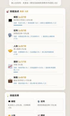 每过一天都会给你一个技能点,可以通过重启人生不断累计,提高自己的技能熟练度。