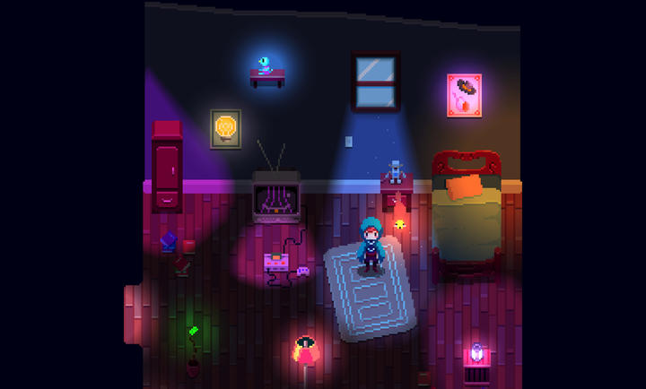 午夜幻想曲用像素画面展现这个童话般的异世界。虽然这是午夜的冒险,场景多少有些昏暗,但为了展现童话的氛围,色彩的使用依然非常丰富。游戏的场景虽然都在屋子里但很具有想象力,不论是阁楼上的花园,还是地下室通往的矿洞,或是阳台上眺望的景色,都让人期待打开这扇门会看到怎样场景。
