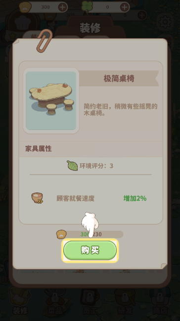 员工招募:招募厨师奇奇、调酒师威廉等个性员工,分配工作任务提升经营效率,员工升级可解锁专属剧情与技能。
