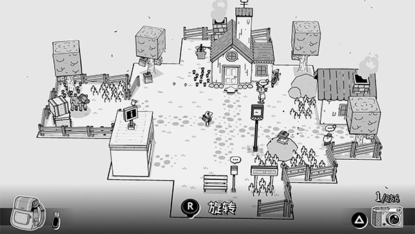 游戏采用黑白手绘与3D元素结合的设计,场景如童话绘本般简洁,人物为纯2D,搭配3D立体物件(如树木、建筑),营造独特视觉层次。