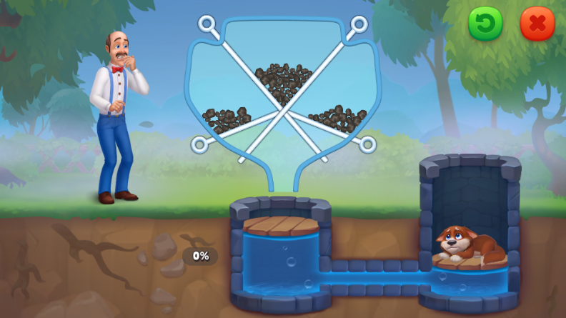 6、玩家需要巧妙移动关卡堵住污水和砸死鲨鱼最终走到终点