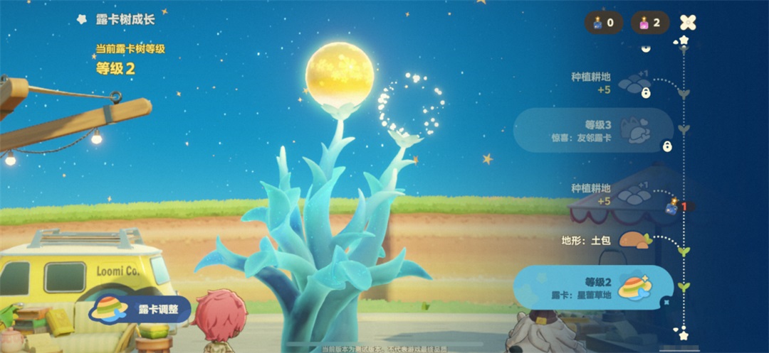- 星球进化:当露卡能量积累满后,玩家可手持露卡能量瓶浇灌星球中心的“露卡树”,触发星球阶段性成长,解锁新地块、引入新生态,进而开启新的探索与建设循环,实现“亲手种下并浇灌一颗星球”的核心体验,让星球随玩家行为持续变化,充满生命力。