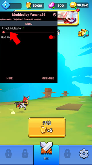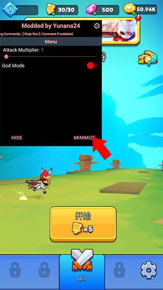 4、之后点击下方的Godmode,并点击MiniMize最小化悬浮按钮并进入游戏,即可体验割草的快感