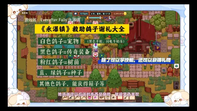 总结:永瀑镇是一款非常优秀的种田游戏,无论是从完成度、玩法内容的广度和深度还是美术风格上来说。我入坑时还只是1.0版本,现阶段已经2.0版本,增添了许多后期内容并完善了一些肝度超标的地方(例如新钓具可以钓到没有遇见的鱼),想要全收集可能要上百小时左右。整体游戏进程平缓,一个季节一个主线副本的节奏很好,第一年体验完主线第二年开始做博物馆收集乐此不疲。