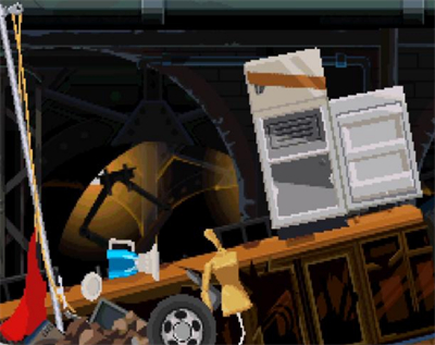 3.关闭冰箱门来到左边。先操作搅拌机,然后去左边。操作电风扇后快速附在旗帜上,到达上层。