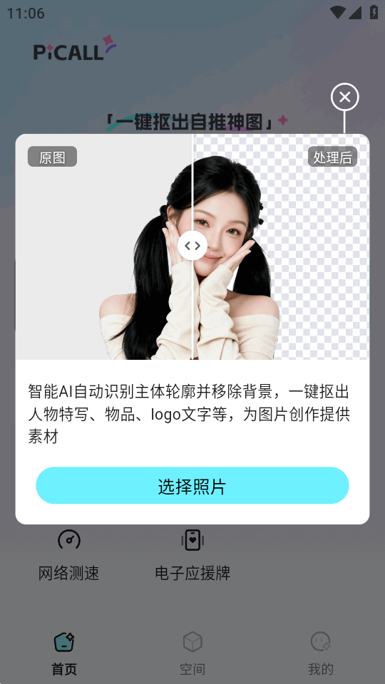 新出的一款结合了ai功能的一键创作应援素材的工具,Picall一键抠图修图工具箱,支持ai智能抠图,轻松方便抠图效果非常好,还有画质修复,让你的图片更清晰效果更好,能将图片杂物一键消除操作方便,水印路人都不要,还有各种实用小工具,助力抢票和应援电子led屏功能等你免费使用。