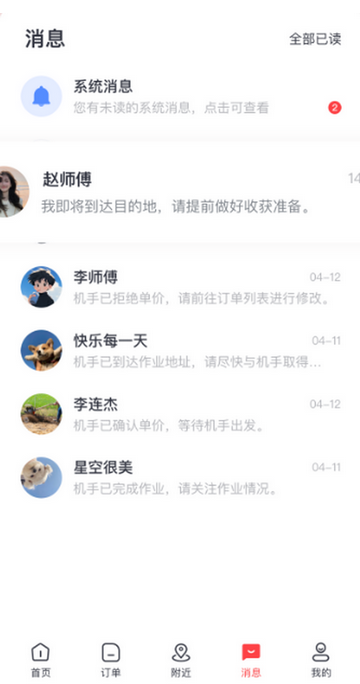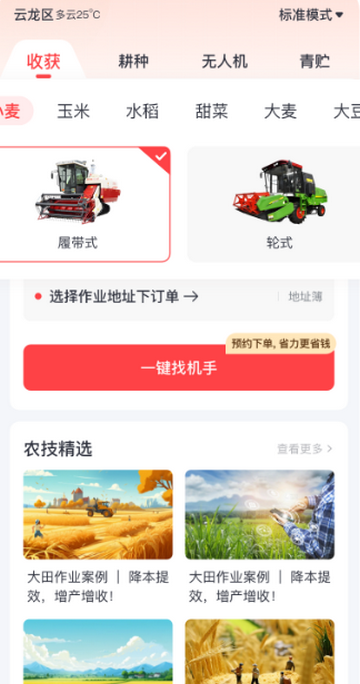 2、耕种管收线上叫车功能,打破农户找车难、对接慢的困境,机手资源充足,接单响应及时。