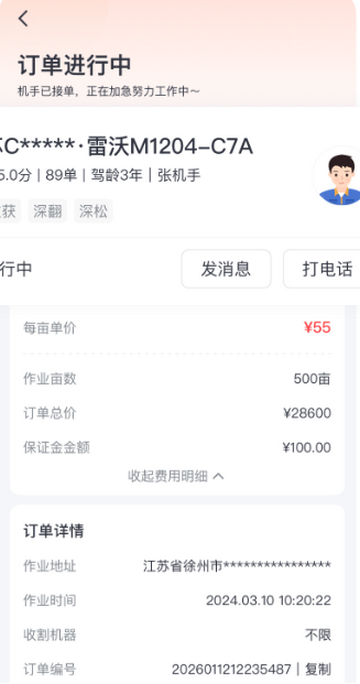 5、通过订单板块,查看农机叫车、农资采购订单进度,便捷沟通相关服务细节。