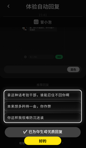 5、回复收藏功能,支持收藏心仪的高情商回复,后续可直接复用,提升沟通效率。