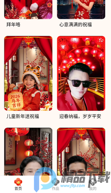 AI新春祝福是一款以智能AI生成器为核心的新春祝福类应用软件,是帮助用户轻松生成各式各样的马年拜年视频,通过导入个人照片、选用内置素材模板,一键智能生成特效拜年视频,同时提供多种创意祝福玩法,为用户打造新颖、有仪式感的新春拜年体验,满足各类人群的新春送福需求。