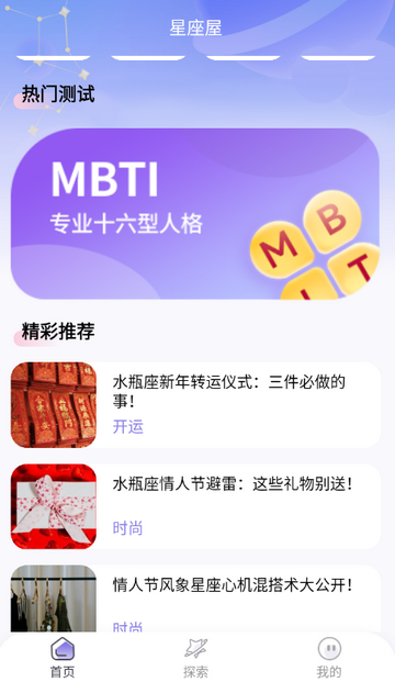 1、以“全面星座查询+热门MBTI测试”为核心,兼顾兴趣与实用,辨识度极高。