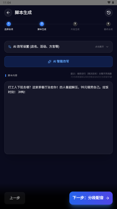 AI 脚本创作: 集成 GLM-4 模型,根据店名和活动一键生成吸引人的短视频脚本。
