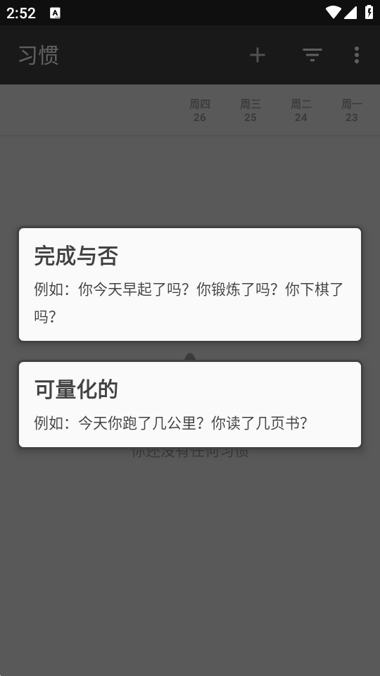 未填写勾选是应用自动添加的勾选,而非用户手动添加的。这种情况发生在非日常习惯上。例如,如果你有一个习惯每周只应该重复一次,并且你在某个星期一做,应用会自动在周二、周三等日添加未填写的勾选。为了防止未填写的勾选出现,请更改该习惯的频率。