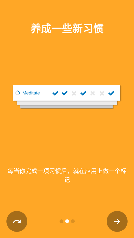 你不是用叉号或勾选,而是用破折号跳过一天。这意味着这一天的习惯被跳过:这样分数保持不变,连胜纪录也不会被打破。这在无法完成习惯的情况下非常有用,比如需要在某个地点但你不在时。-