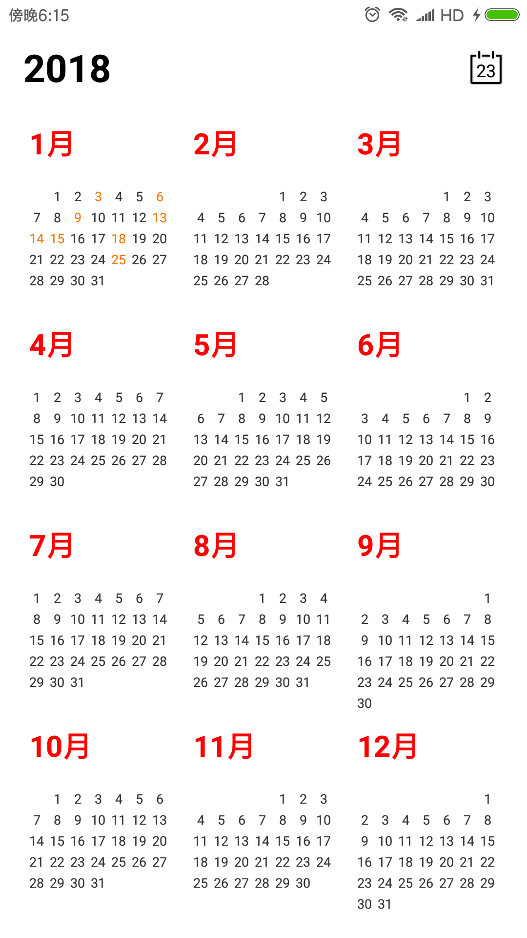 超高性能和免费自定义界面!垂直和水平,渲染速度快,内存极低。Android上一个优雅、万能自定义UI、仿iOS、自定义动画,支持垂直、水平方向切换、支持周视图、自定义周起始、性能高效的日历控件,热插拔实现UI定制!Canvas绘制,渲染速度快、占用内存低,你真的想不到日历居然还可以如此优雅。