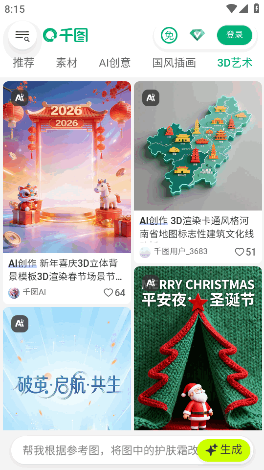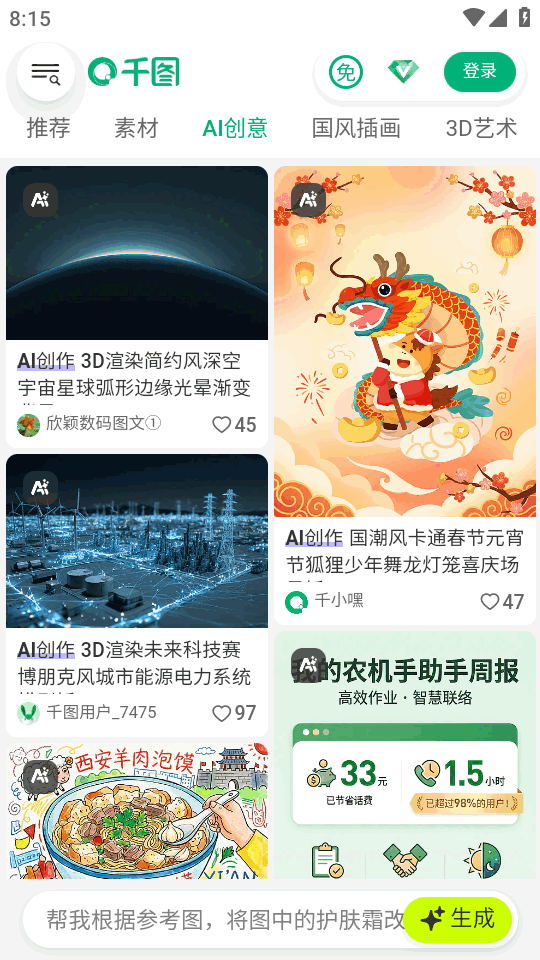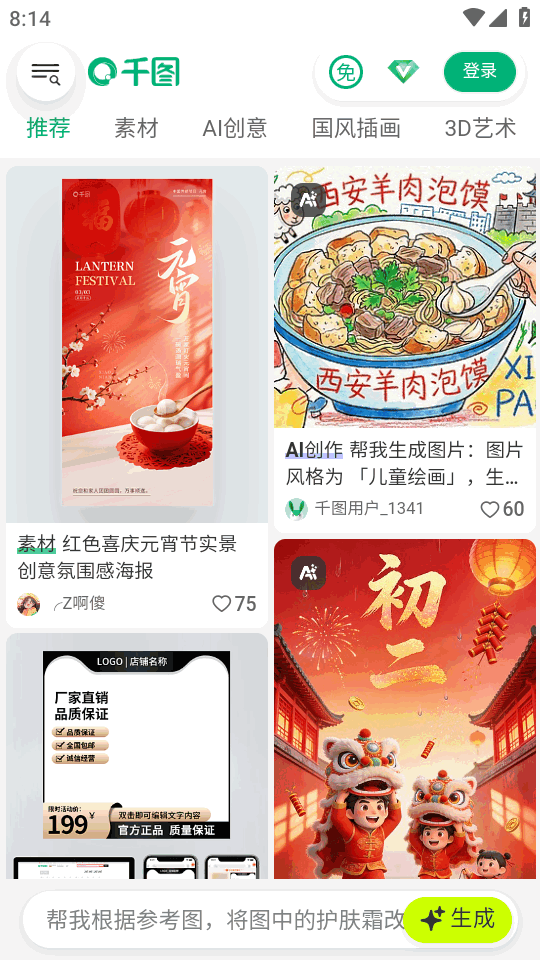 千图网官方接入ai的手机客户端正版,千图网app下载安装后可以快速浏览和下载需要的图片,深度优化了ai生图及ai视频生成等功能,快速生成且免费下载,多款模板可以选择,轻松帮助想要制作各种商图的朋友们使用。