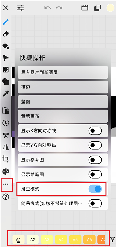 3)想要显示拼豆色号的话,就点击编辑页面左侧下方的三点按钮,打开【拼豆模式】就可以了。