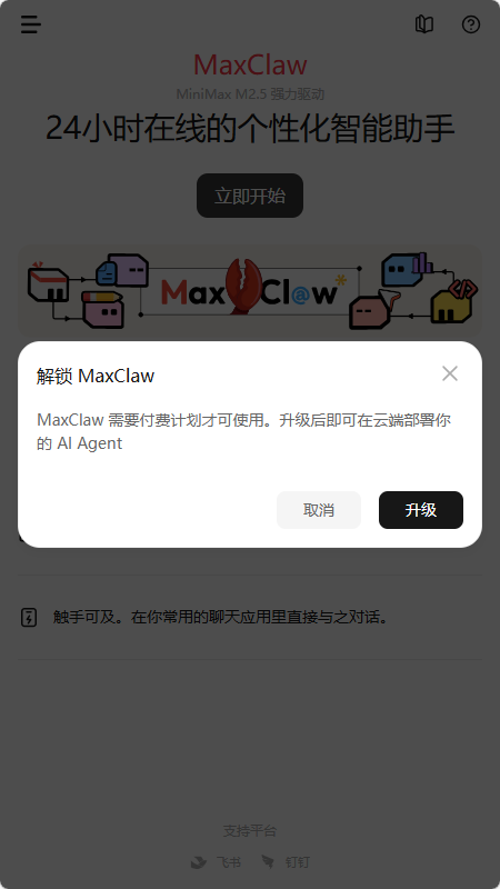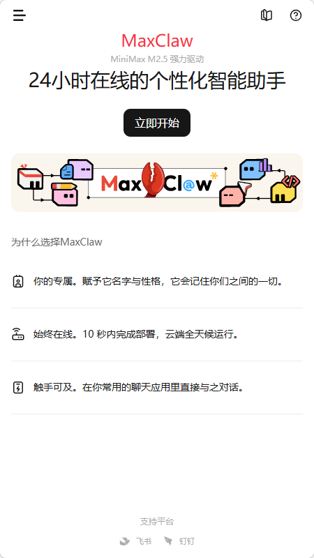 MaxClaw是基于OpenClaw的云端AI助手服务,可以为你在云端部署并运行OpenClaw实例,接入MiniMax自有模型,无需自备服务器或 API Key,开箱即用。