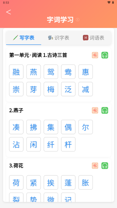 完整收录 1–6 年级写字表、识字表、词语表