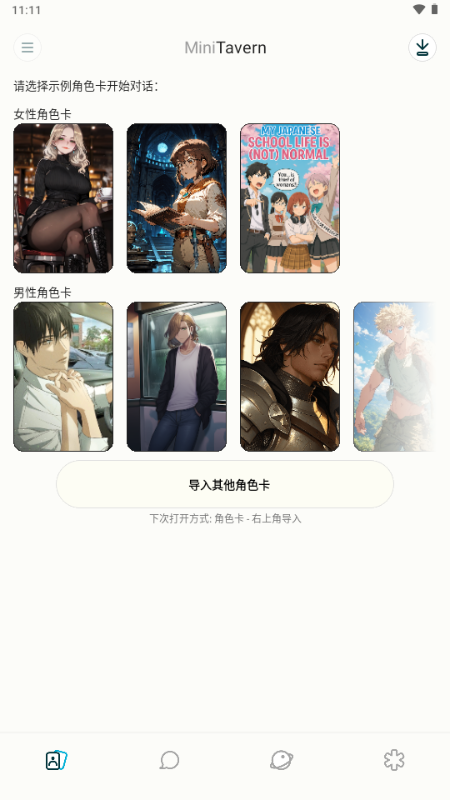 轻松导入 SillyTavern 的 .png 或 .json 角色卡(包括内置样本、社区分享及支持图片/URL 的卡牌)。
