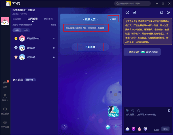 2、进入房间后,你可以点击编辑直播公告,然后再点击开始直播