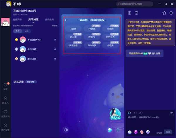 3、点击开始房间后需要先选择一种房间模板,选择后不可更改,直播开始后就可以等待观众进入啦