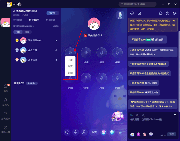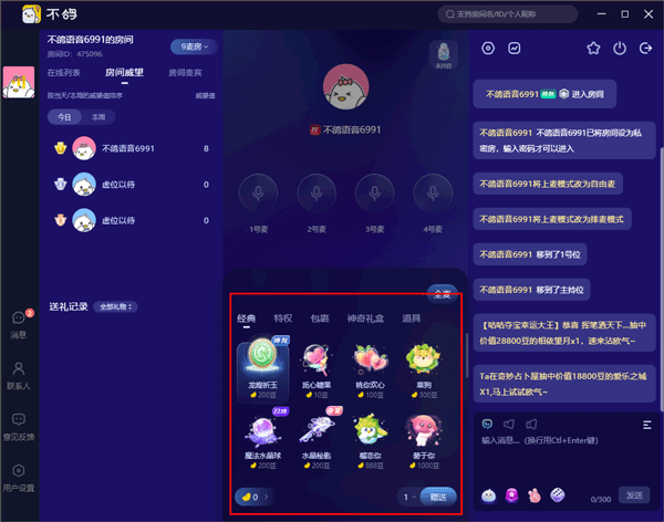 6、点击下方礼物按钮,可以为麦上喜欢的用户送礼