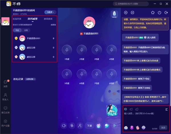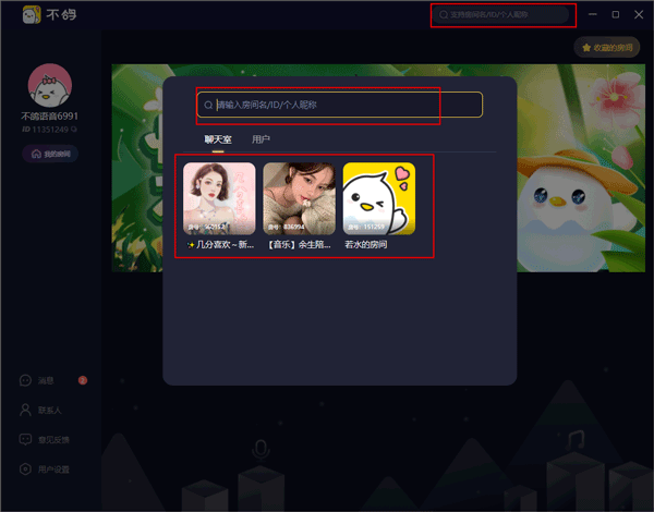 8、另外你也可以在上方搜索栏中,搜索其他用户房间号进行他们的房间内进行聊天、上麦、送礼等操作