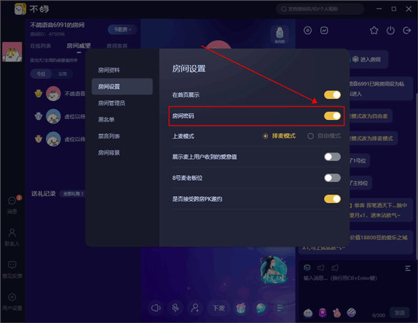 4、若需要将房间设置为私人房间可以点击设置按钮进入房间设置界面,然后将房间密码功能开启。当然你也可以再这里选择你需要的功能开启或者关闭