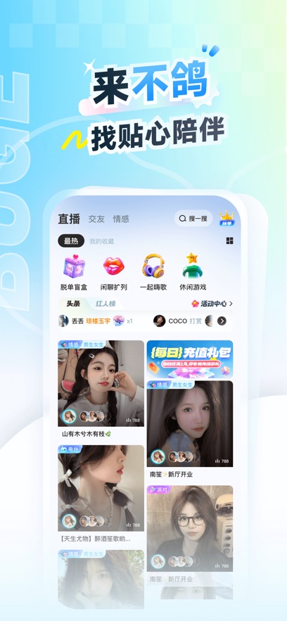 不鸽电竞极速版是一款主打语音社交与线上陪伴的互动平台,主打无压力社交模式,无需出镜即可轻松参与互动,有效降低现实社交顾虑,为用户营造轻松自在的交流环境。平台汇聚大量语音聊天室,涵盖娱乐、情感陪伴等多种主题,玩法丰富多样,能够快速打破陌生感。