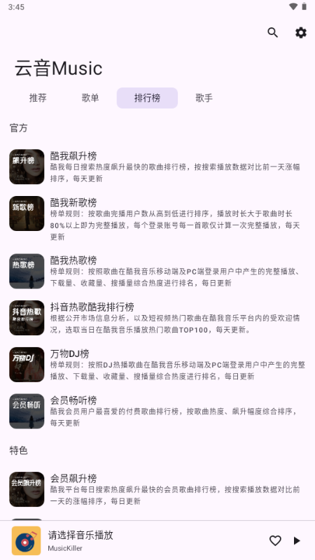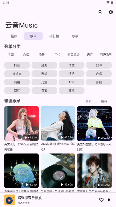 云音 Music是一款轻便易用的移动端音乐应用,主打随时随地流畅听歌,为用户打造便捷的随身音乐体验。应用内置丰富的曲库资源,覆盖流行、摇滚、民谣、电子、影视原声等多种音乐风格,无论是热门新歌还是经典老歌都能找到,基本满足日常听歌需求。