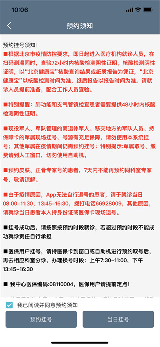 3、查看预约须知,然后根据自己的需求选择“预约挂号”还是“当日挂号”;