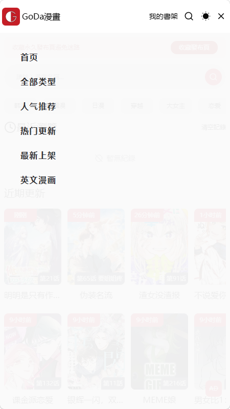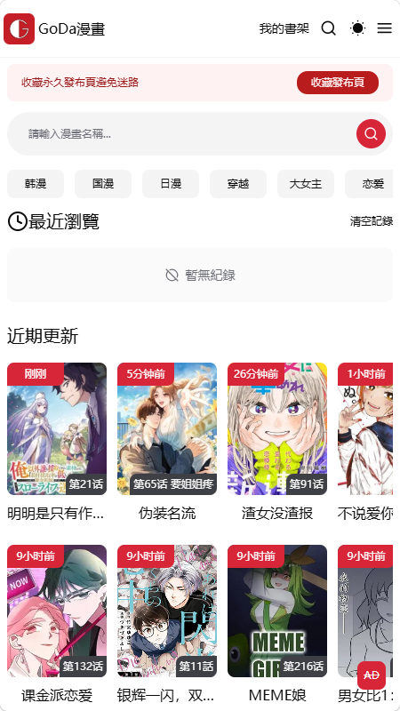 G 站漫画又名 Goda 漫画,是一个资源覆盖面极广的在线漫画阅览平台,汇集了来自国内、日本、韩国及欧美等多个地区的作品,总量接近三万部,能够满足不同读者的题材偏好。平台更新频率较快,热门新作与连载漫画都能及时跟进,读者无需漫长等待即可追更。
