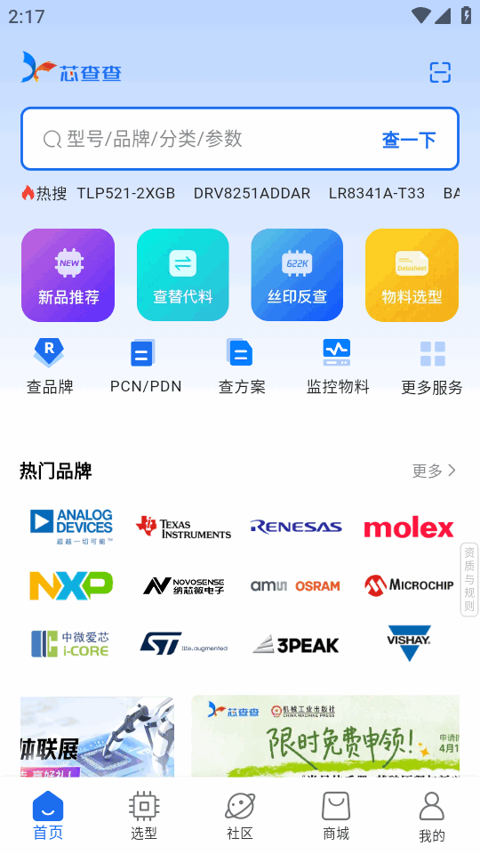 芯查查是为电子工程师、采购人员等打造的一站式智能平台。集成行业信息查询与供应链服务,有实时库存查询、精准替代选型等功能,涵盖丰富产品信息,支持多维度筛选,还能同步云端数据,满足多样需求。