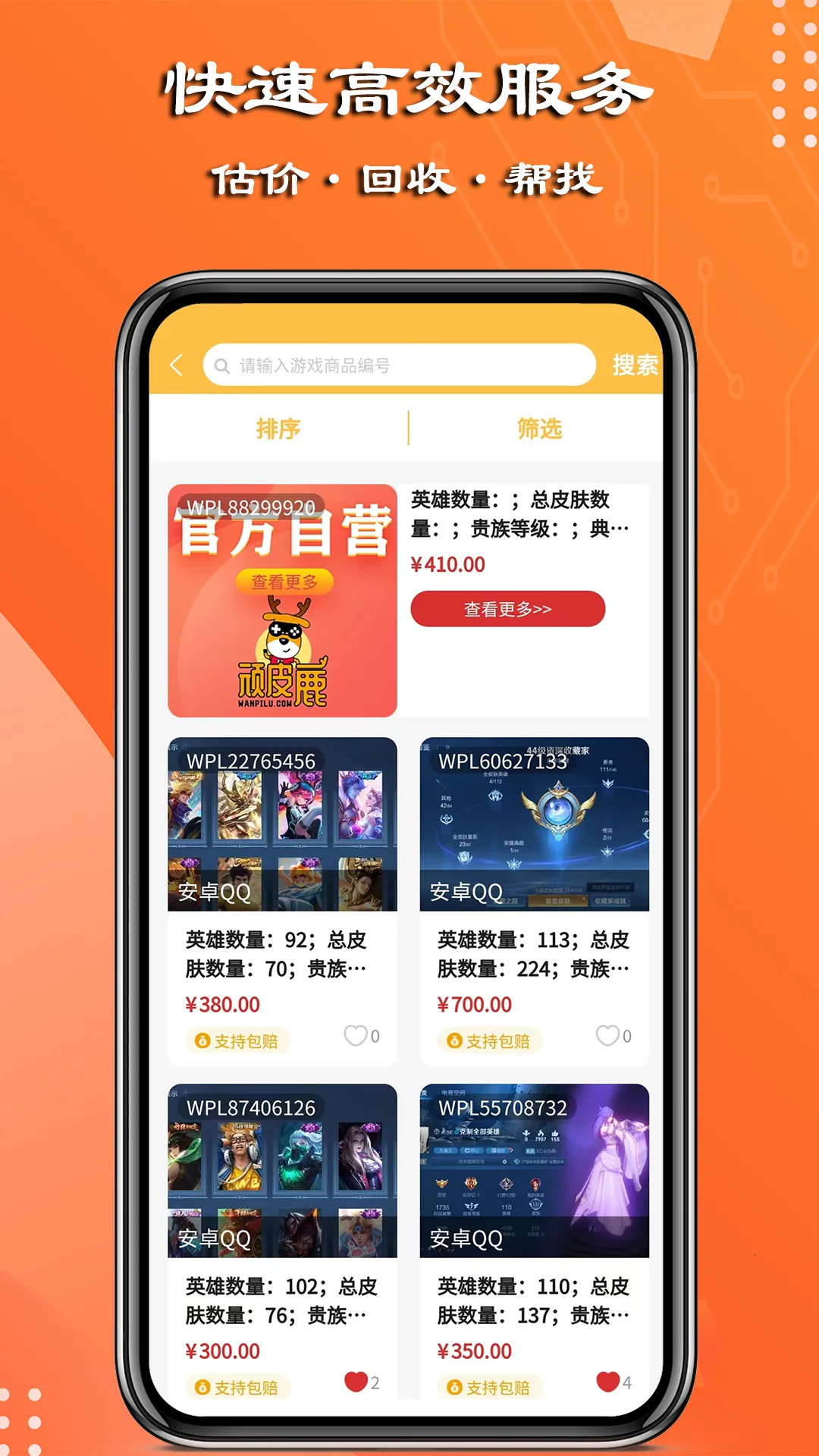 在顽皮鹿平台应用首页,你可以浏览到各种游戏账号的推荐信息,包括热门游戏、新上架账号等。