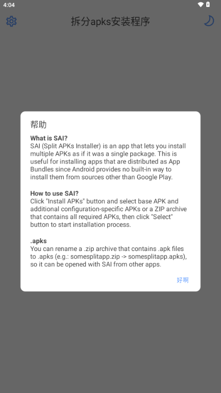 .apks 你可以将包含apk文件的.zip存档重命名为.apks(例如:somesplitapp.zip->somesplitapp.apks),这样其他应用就可以使用SAI打开它了。