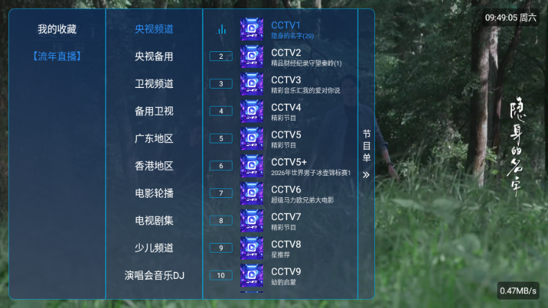 流年直播是一款主打简洁流畅的电视直播类应用,整体设计轻量化,核心聚焦稳定播放与清晰画质,为用户提供省心的观看体验。应用内置全面的频道资源,覆盖央视全套、各大上星卫视以及各地地方台,日常收看新闻、综艺、剧集和体育赛事都能轻松满足。