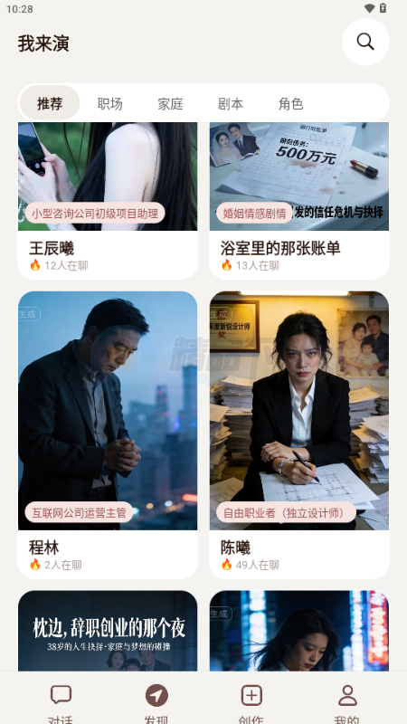 我来演是一款面向创作爱好者与内容生产者打造的沉浸式角色扮演与剧本创作工具,主打灵感捕捉与故事演绎,为用户提供灵活多元的创作空间。应用围绕角色塑造、剧本编排与互动对话三大核心功能展开,支持用户从设定人物、搭建世界观到生成完整剧情。